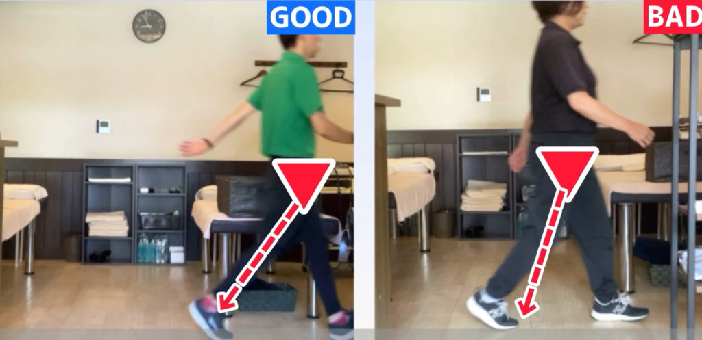 正常歩行では、踵から膝を伸ばして着地して上半身と体幹が安定し、